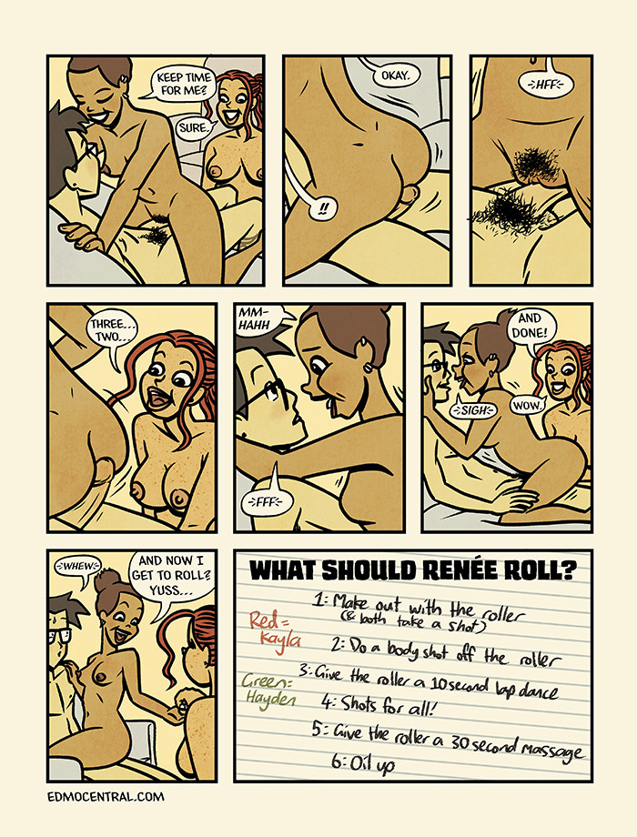 Kayla, Hayden and Renée’s evening of drinking and debauchery is being determined by the roll of the dice, and the roll of the dice is going to be determined by … you! That’s right – vote in the comments each round and tell me which numbers you’d like them to roll, and whichever ones get the most votes is what I’ll draw in the next pages of the comic. Each colour represents a player, each number is a different action.